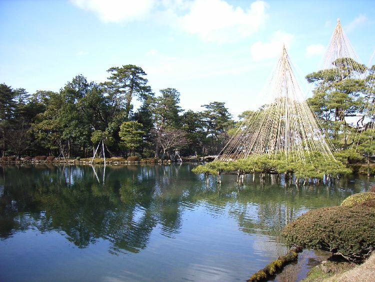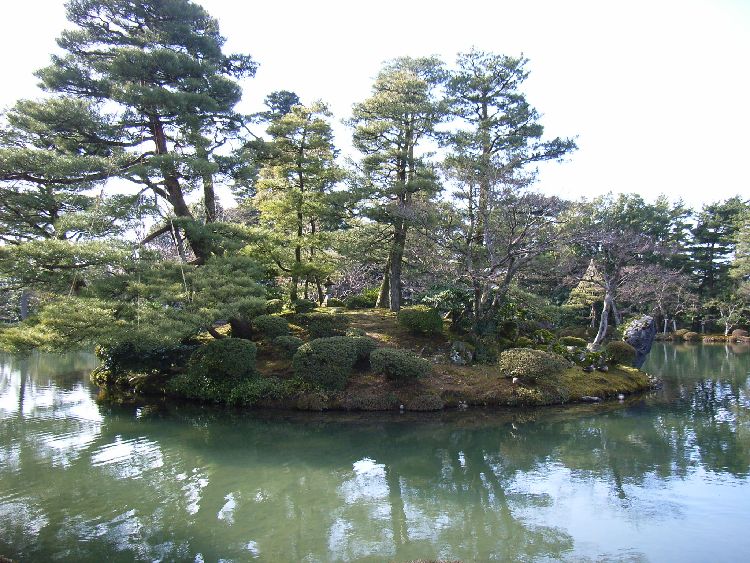 霞ヶ池(金沢市)概要: 霞ヶ池は兼六園の中央にあります。金沢藩13代藩主前田齊泰が 主に整備したもので、案内板によると「天保8年(1837)に堀り広げられた池で、広さは5800平方メートル。池の中の島は、蓬莱島いい、不老長寿をあらわしており、また亀の甲の形をしているので、別名、亀甲島ともいう。」とあります。霞ヶ池には蓬莱島の他にも、琵琶湖にある唐崎松の種から育てた唐崎松、虹橋、内橋亭、徽軫灯籠、栄螺山などの名勝が散りばめられ、それらを回遊できるような構成になっています。園内の中でも一番の見所と言えます。